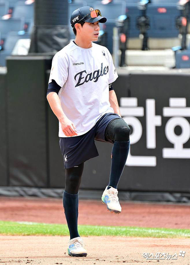 14일 오후 대전 한화생명 볼파크에서 열리는 '2025 신한 SOL Bank KBO리그' LG 트윈스와 한화 이글스의 경기, 한화 심우준이 주루 훈련에 임하고 있다.