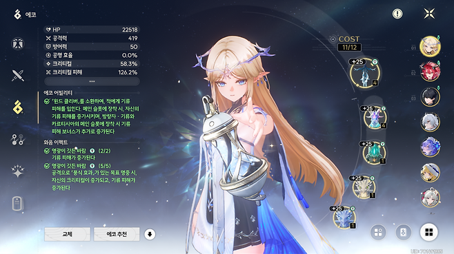 공명 해방 딜러지만 공명 효율 요구치는 높지 않다. 기류 방랑자와 편성할 경우 부 옵션으로 공명 효율 한 줄만 챙겨도 무방하다.