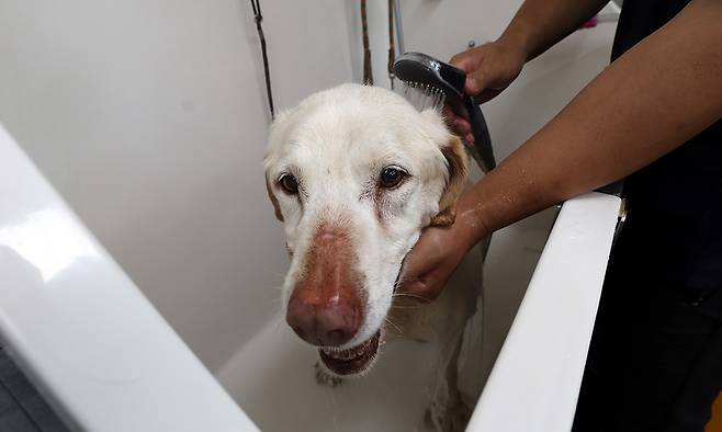 김동영 사양관리사가 벨라(2018년생, 래브라도리트리버) 목욕을 시켜주고 있다.