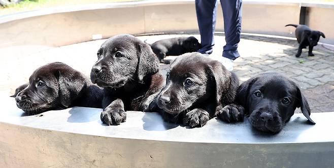 “오덕아, 한 번만 더 뛰자. 점프!” 마약탐지견 ‘오덕’(2024년 6월생, 래브라도리트리버)이 뜨거운 여름 햇살이 내리쬐는 오후 인천 영종도에 위치한 관세청 탐지견훈련센터 운동장에서 정희찬 훈련교관의 지시에 따라 장애물을 가뿐하게 뛰어넘고 있다. “잘했어!”