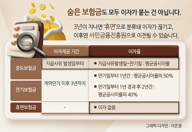 생명보험 표준약관 제37조에 따르면 ▷중도 보험금은 지급 사유 발생일부터 계약 만기 후 3년까지 ▷만기 보험금은 계약만기 이후 3년까지 이자가 붙습니다. 그 이후 단계인 휴면 보험금은 이자도 끊기고, 일정 시간이 지나면 서금원으로 출연될 수도 있어요.