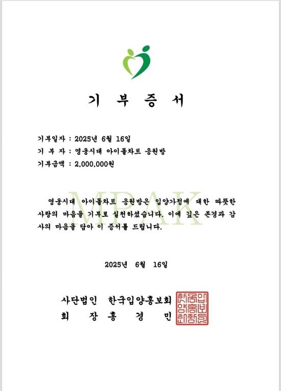 '영웅시대 아이돌차트 응원방'이 '웅탄일'을 기념해 입양 가정에 200만 원을 기부했다.