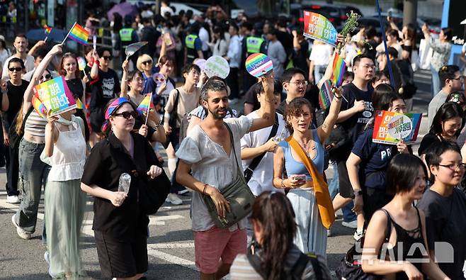 [서울=뉴시스] 김선웅 기자 = 14일 서울 중구 을지로 일대에서 열린 제26회 서울퀴어문화축제 참가자들이 퀴어퍼레이드를 하고 있다. 2025.06.14. mangusta@newsis.com