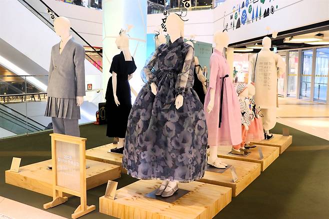 쇼핑몰 2층에 올라가자 이번 행사를 찾은 업체들이 전시한 한복이 눈에 띈다. 마네킹 위에 한복을 입혀 놓은 모습이 꽤나 자연스럽다. '역사 선생님 교복' 느낌을 주는 개량한복 대신 더욱 세련되어 일상생활에서도 입기 좋은 생활한복도, 한글 자음으로 색깔을 낸 색동저고리도 어여쁘다.