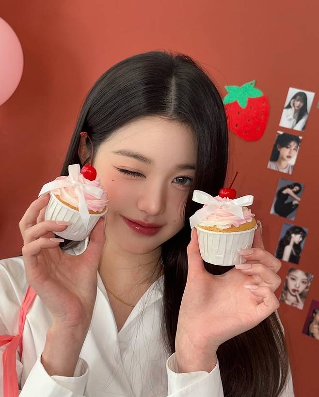 공개된 사진 속 장원영은 딸기, 체리, 컵케이크 등으로 장식된 파티룸에서 환한 미소와 함께 사랑스러운 분위기를 연출했다.