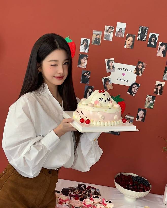 한쪽 벽면에는 'New Balance ♥ Wonyoung'이라는 문구와 함께 장원영의 다양한 사진이 장식돼 있었고, 테이블 위에는 브랜드 로고가 새겨진 컵케이크와 체리 케이크, 과일 등이 놓여 있어 특별한 시간을 암시했다.