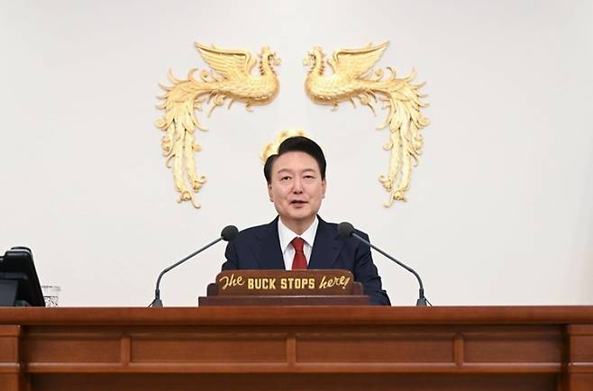 | ▲ “The BUCK STOPS Here” 내란 우두머리 윤석열의 취임 2주년 국민보고 당시 사진. 명패에는 ‘The BUCK STOPS here!(모든 책임은 내가 진다)’라는 해리 S. 트루먼의 좌우명이 새겨져있다. 사진제공=대통령실 |