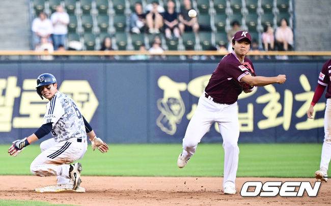 7회말 1사 1루 키움 유격수 어준서가 1루주자 오명진을 포스아웃 시킨 뒤 1루로 송구, 더블플레이를 연결하고 있다. 2025.06.14 /cej@osen.co.kr