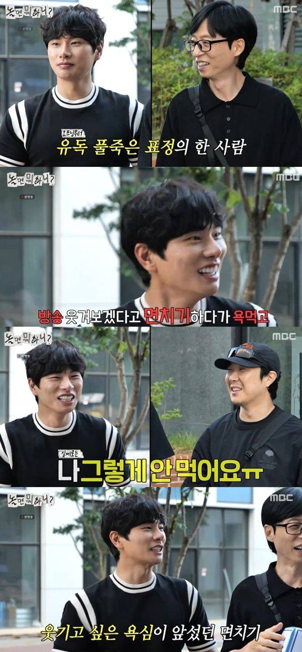 이이경이 유독 풀이 죽은 표정을 짓고 있자 유재석은 "이경이 먹는 것 때문에"라고 면치기 이슈를 언급했다.
