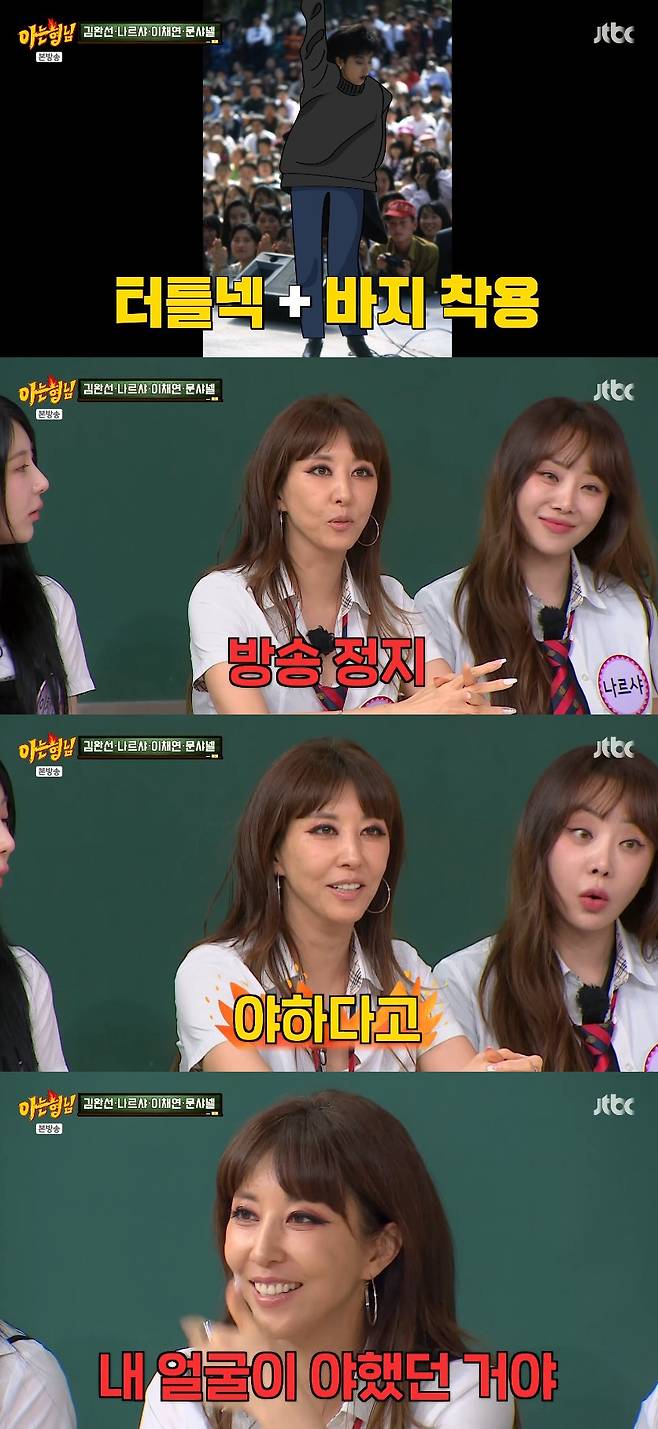 김희철이 "누나가 기억나는 게 온몸을 가리고 있는데도 섹시하다고 그것도 걸리고 그랬다"고 하자 김완선은 "터틀넥 입고 바지까지 입었는데 정지 먹은 적도 있다. 야하다고"라며 방송 정지를 당했던 과거를 회상했다.