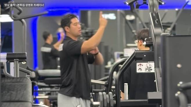 트레이너가 무언가를 열심히 설명하는데, 입보다 손이 더 바쁘게 움직입니다.