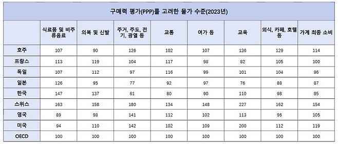 PPP를 고려한 물가 수준은 경제 규모와 환율 등 변수를 구매력 기준으로 보정해 국가 간 물가를 비교할 수 있도록 만든 지표다. 실제 각국 국민이 느끼는 체감 물가 수준을 비교하는 것으로도 볼 수 있다.