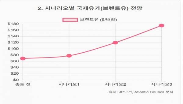 원자재의 경우엔 유가의 급등 폭이 훨씬 커지고 금값도 폭등세를 보일 수 있다. 페리한 알-리파이 임파워미 이니셔티브 선임 연구원은 "이란이 실제 호르무즈 해상교통을 교란하거나 산유 시설 공격을 감행하면 유가는 배럴당 120~130달러 수준까지 유가가 뛸 수 있다"고 전망했다. JP모간은 “최악의 경우 미국 CPI가 5%까지 올라갈 것”이라며 120달러 유가 시나리오를 경고했다. 이는 현재 가격 대비 60~70% 추가 상승한다는 예상이다. 오일쇼크 수준이다.