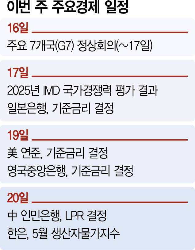 17일까지 캐나다에서 열리는 G7 정상회의도 이목을 끈다. 이 대통령이 트럼프 대통령 및 주요국 정상들을 만나 어떠한 이야기를 나눌지가 관심사다. 이스라엘과 이란의 무력 충돌 진행 상황도 글로벌 금융시장에 영향을 줄 주요 변수다.
