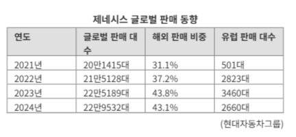 다만 유럽에서의 판매 비중은 비교적 낮은 것이 현실이다. 지난해 유럽지역에서 판매된 제네시스 차량은 2660대로 글로벌 총 판매대수의 1.1%에 그쳤다. 이번 유럽지역 내 시장진출 확대와 함께 르망24시 등 유럽 내 인지도가 높은 모터스포츠 참가를 이어가겠다는 계획도 미국에서 입증된 경쟁력을 유럽시장에서도 가져가겠다는 전략의 일환이다.