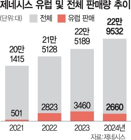 제네시스는 판매량 확대를 위해 최근 뚜렷한 성장세를 보이는 미국 법인과 소통을 이어왔다고 설명했다. 자비에르 본부장은 “지난해 미국의 제네시스 판매량은 7만 5000대에 이르지만 유럽 판매량은 2500대 수준” 이라며 “두 시장을 직접 비교하기는 어렵지만 제네시스 미국 법인을 수차례 방문해 노하우와 인사이트를 배웠고, 이를 통해 (판매 전략을) 지속적으로 개선해 나갈 예정”이라고 말했다. 제네시스의 유럽 판매량은 첫 진출 시점인 2021년 501대를 시작으로 2022년 2823대, 지난해 2660대 등 부진했다.