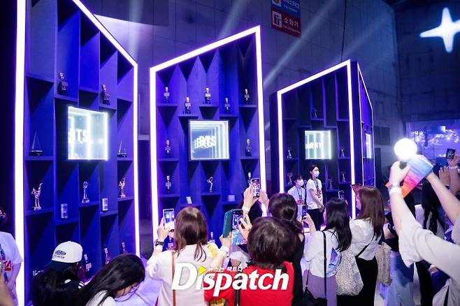 총 50개의 트로피가 전시된 '트로피 존'은 인증샷 필수 코스였습니다. 방탄소년단의 역사적인 순간들을 한눈에 볼 수 있었습니다.