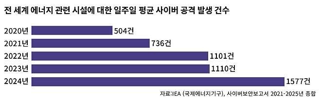 국제에너지기구(IEA)의 연간 사이버 보안 보고서를 종합하면, 전 세계 에너지 시설에 대한 사이버 공격은 2020년에는 한 주 평균 504건이었으나 2024년 3배가 넘는 1577건으로 늘었다(〈그림〉 참조). 전문가들은 러시아의 우크라이나 침공 같은 정치 상황, 그리고 계속 디지털화되고 있는 유럽의 전력망을 사이버 공격의 주된 동기로 꼽는다. 2022년 말 러시아의 해커 조직 샌드웜이 우크라이나의 주요 에너지 인프라 조직을 표적으로 삼아 감행한 다중 사이버 공격, 2023년 5월 덴마크의 에너지 기반 시설을 운영하는 22개 기업이 동시에 받았던 사이버 공격 등도 정치적 목적의 공격이었다.