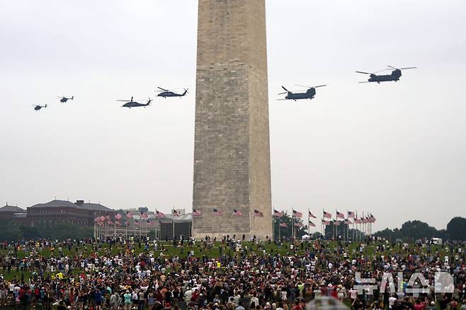 [워싱턴=AP/뉴시스] 14일(현지 시간) 워싱턴에서 열린 미 육군 창설 250주년 기념 군사 열병식에서 미 육군 제160특수작전항공연대 소속 헬리콥터들이 워싱턴 기념비 주변을 비행하고 있다. 왼쪽부터 MH-6 리틀버드, MH-60 블랙호크, MH-47 치누크. 2025.06.15.