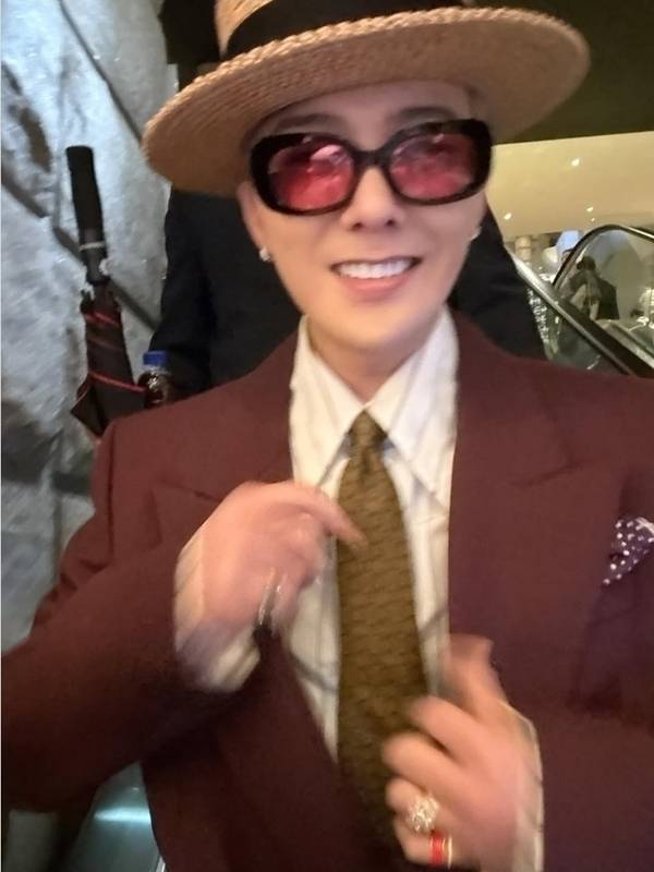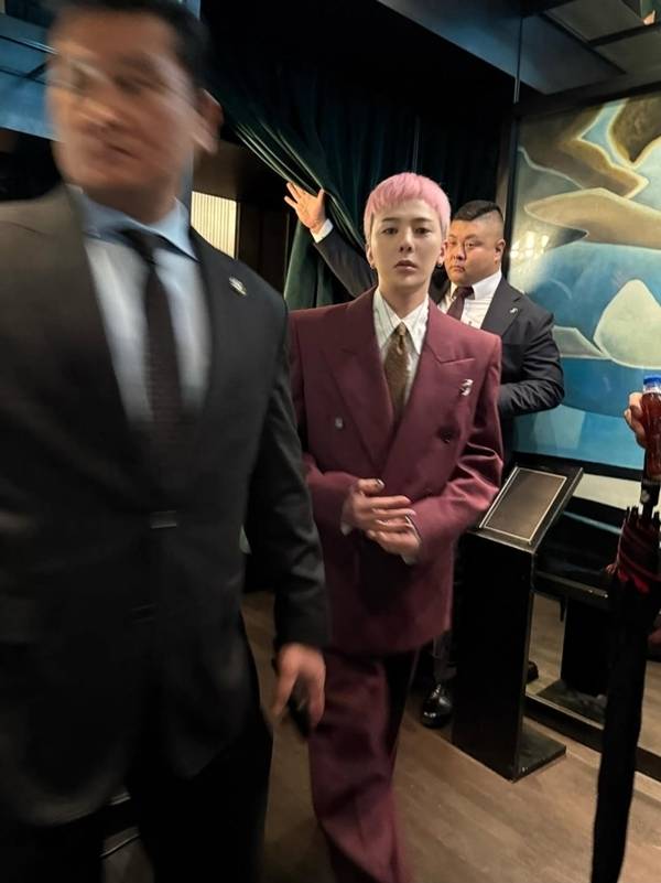 공개된 사진 속 그는 더블버튼의 와이드 버건디 수트에, 핑크 컬러의 투블럭 헤어, 그리고 은은한 포켓 스퀘어까지 더해 GD 특유의 ‘포멀을 위장한 자유’를 보여줬다.