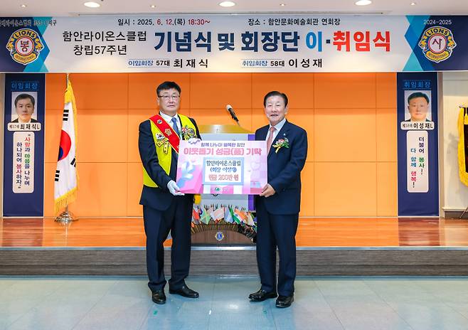 함안라이온스클럽은 6월12일 함안문화예술회관 연회장에서 제58대 이·취임식을 개최하고 지역사회에 따뜻한 나눔을 실천하는 기탁식을 함께 진행했다.