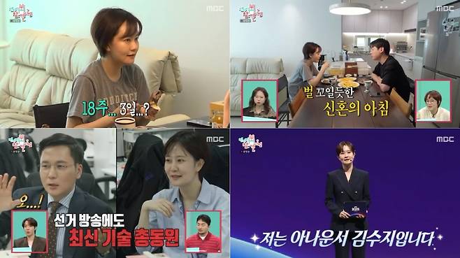 'MBC 뉴스데스크' 앵커 김수지 아나운서의 다채로운 하루가 펼쳐졌다. 아나운서, 작가, 작사가 등 '프로 N잡러'로 화제를 모았던 김수지는 새로 이사한 집 공개와 함께 "10월 중순 출산 예정이다. 태명은 빅희"라고 임신 소식을 최초 고백하며 참견인들에게 진심 어린 축하를 받았다.