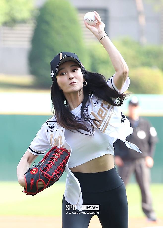 화이트 크롭티에 레깅스를 매치한 캐주얼한 시구 패션으로 마운드에 오른 하원미 씨는 연예인 못지않은 비주얼로 현장의 이목을 집중시켰다.