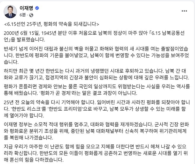 이 대통령은 이날 6·15선언 25주년을 맞아 페이스북에 이 같은 메시지를 담은 게시물을 올렸다.