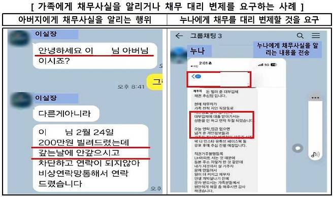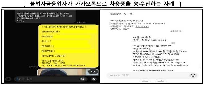 셋째로 등록 대부업자가 아님에도 카톡을 통해 차용증 등을 요구하면서 금전을 대부하는 행위 또한 불법이라 신고 대상입니다.