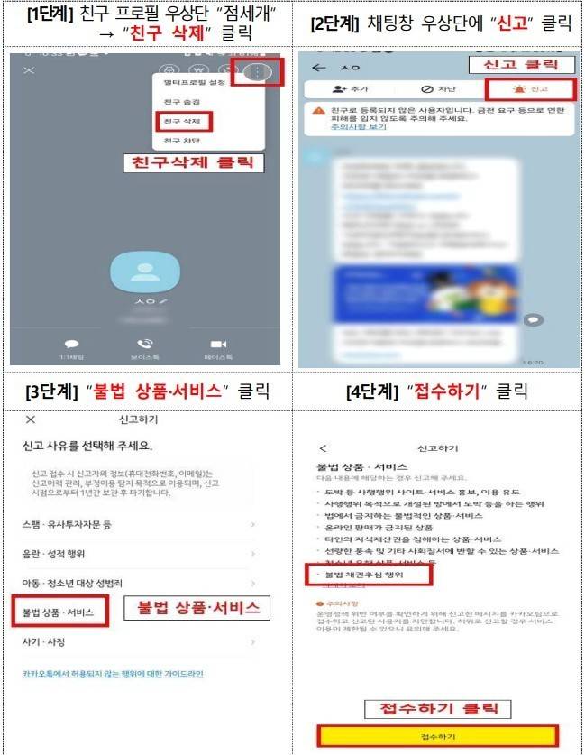 카톡을 통한 불법사금융 피해 발생시 카톡 앱을 통해 즉시 신고 가능하며, 다음 달부터는 금감원 홈페이지를 통해서도 신고할 수 있습니다.