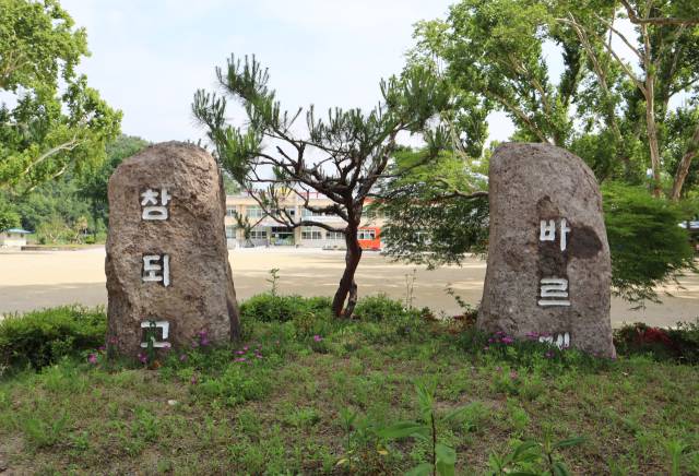 드디어 학교 입구에 닿는다. 그런데 문이 없다. 철문도 차단봉도 없이 숲과 길이 자연스럽게 이어진 열린 입구다. 가깝게 두 개의 돌기둥이 우뚝 서 있다. 왼쪽에는 '참되고', 오른쪽에는 '바르게'라는 글자가 또렷이 새겨져 있다. 임고 초등학교의 교훈이다. 돌기둥 사이로는 키 작은 소나무 한 그루가 조용히 자라고 있고 그 너머로는 믿기 어려울 만큼 우람한 거목들이 자리를 지키고 있다.