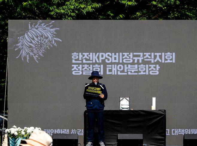 | ▲ 한전 KPS 비정규직지회 정철희 태안분회장 14일 오후 4시 태안화력 고 김충현 비정규직 노동자 2차 추모문화제에서 정철희 태안분회장이 명확한 진상 규명과 책임자 처벌 및 재발 방지 등의 발언을 하고 있다. |