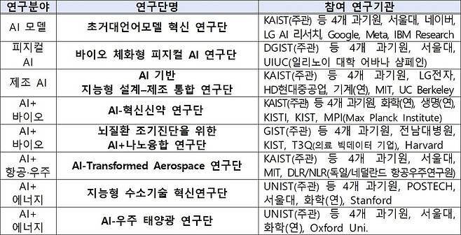 4개 과학기술원은 2025년도 추가경정예산안 확정 직후 외부 전문가 평가를 거쳐 AI모델, 제조AI, AI바이오, AI에너지 등 AI 융합 분야 8개 이노코어 연구단을 선정했다.
