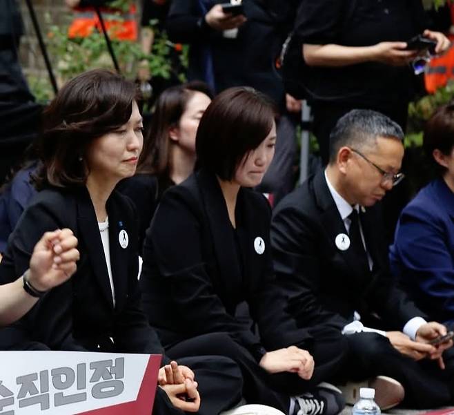 | ▲ 집회에 참가한 조국혁신당 강경숙 의원과 더불어민주당 백승아 의원, 김문수 의원이 추모편지를 들으며 눈시울을 붉혔다. |