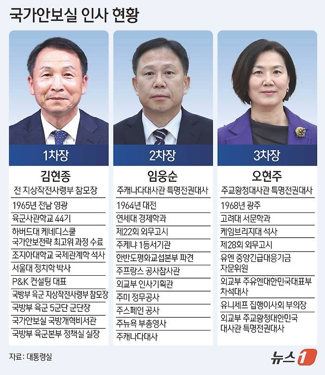 (서울=뉴스1) 김초희 디자이너 = 이재명 대통령은 15일 국가안보실 1·2·3차장에 김현종 전 지상작전사령부 참모장과 임웅순 주캐나다대사관 특명전권대사, 오현주 주교황청대사관 특명전권대사를 각각 임명했다.