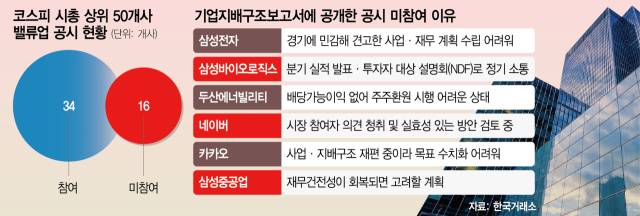 새 정부 출범 이후 주주가치 환원에 대한 기대감이 커지는 가운데 코스피 시가총액 상위 50개 종목 중 16곳이 기업가치제고(밸류업) 공시에 참여하지 않은 것으로 나타났다. 이 중에