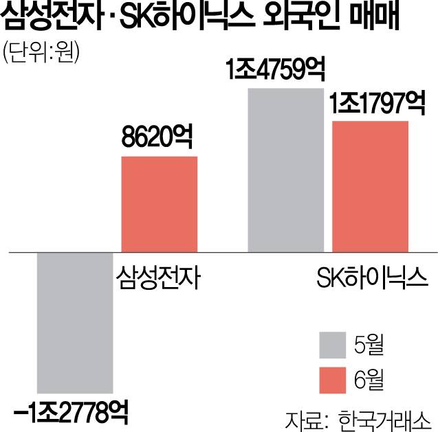 15일 한국거래소에 따르면 외국인은 이달 들어 삼성전자와 SK하이닉스(000660)를 각 8620억 원, 1조 1797억 원씩 순매수한 것으로 나타났다. 지난달에는 SK하이닉스를 1조 4759억 원어치 사들인 반면 삼성전자 1조 2778억 원가량을 정리했다.