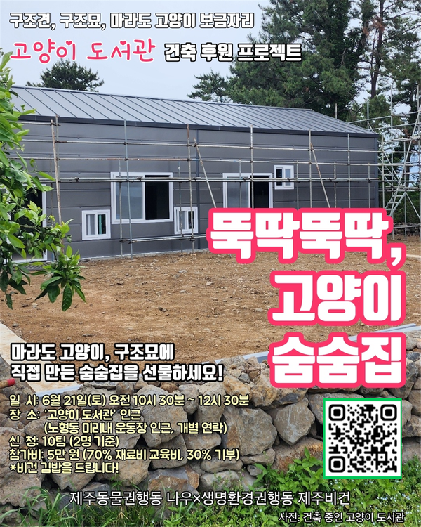 (사)제주동물권행동 나우, (사)생명환경권행동 제주비건은 오는 21일, 구조견·구조묘·마라도 고양이 보금자리 '고양이 도서관' 건축 후원 프로젝트 '뚝딱뚝딱! 고양이 숨숨집'을 진행한다.