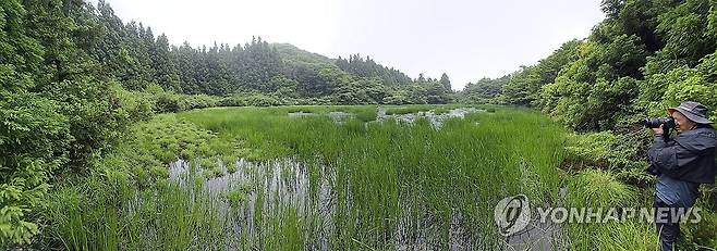 (서귀포=연합뉴스) 김호천 기자 = 제주 서귀포시와 서귀포시협약인증습지도시등지역관리위원회가 람사르 습지도시 인증 프로그램 지원사업의 하나로 운영하는 시민습지탐사대 대원이 15일 서귀포시 안덕면 상천리에 있는 영아리오름 습지인 속칭 '행기소'를 찾아 조사를 하고 있다. 전날 내린 폭우로 물이 가득 들어찬 비경을 뽐내고 있다. 2026.6.15