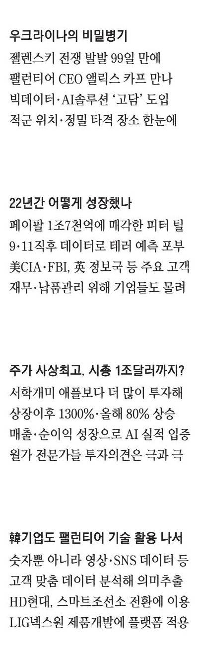 2002년 틸은 페이팔을 이베이에 15억달러(약 1조7000억원)에 매각했고, 그때 번 돈으로 창업한 회사가 팰런티어입니다. 일론 머스크 테슬라 CEO가 페이팔을 매각해 번 돈으로 스페이스X를 창업한 것과 비슷하죠. 이들이 괜히 '페이팔 마피아'로 불리는 게 아닙니다. 틸은 2001년 9·11 테러를 경험한 뒤 어떻게 테러를 예측할 수 있을까 고민했고, 데이터로 테러를 예측해보겠다는 계획이 창업의 동기가 됐습니다. 미국 중앙정보국 CIA가 만든 벤처캐피털인 인큐텔(IQT)이 팰런티어에 자금을 댔죠. CIA를 비롯해 미국 연방수사국(FBI)과 국가안보국(NSA), 국방부, 영국 비밀정보국(SIS) 등이 주요 정부 고객이고요. JP모건을 비롯해 크라이슬러, 에어버스 등이 팰런티어의 민간 고객사입니다. 틸의 저서 '제로 투 원'에서처럼 독보적인 기술로 독점적인 시장을 만드는 회사가 되기 위해 회사 인력 4000명의 대부분이 개발자 등 연구개발 인력입니다. 전체 임직원 중 세일즈 인력은 3~4% 수준밖에 되지 않는 것으로 전해집니다.