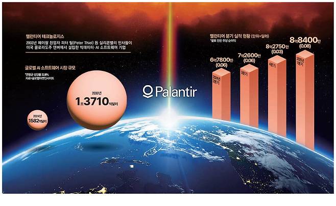 팰런티어는 페이팔 창업자인 피터 틸이 현재 CEO인 카프 등과 함께 2003년 창립한 빅테이터 전문 분석 조사업체입니다. 빅데이터를 분석하는 데 AI를 쓰기 때문에 AI 소프트웨어 업체로 분류됩니다.