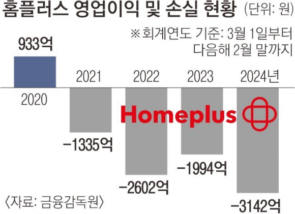 홈플러스의 2024회계연도(2024년 3월~2025년 2월) 영업손실 규모는 -3141억원으로 전년 대비 57.5% 늘었다. 2021회계연도 이래 4년 연속 적자다. 1년 내 현금화가 가능한 유동자산은 8578억원인 데 반해 유동부채는 2조 6499억원으로 3배가 넘는다.