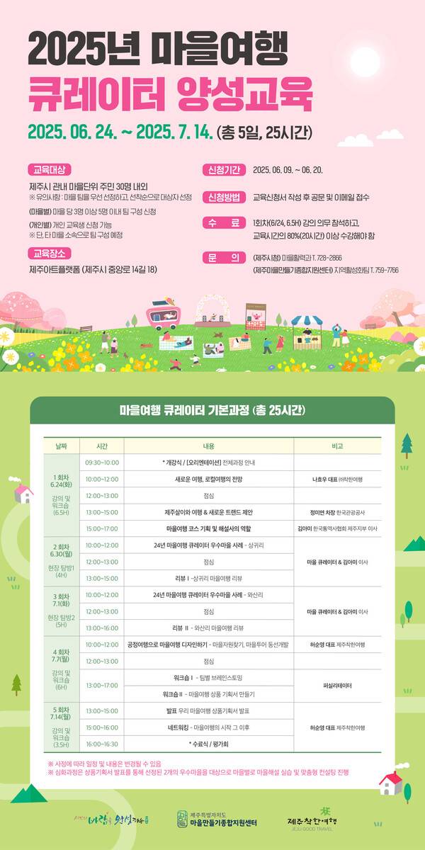 제주시는 오는 20일까지 마을 고유 자원을 활용한 주민 주도형 관광 콘텐츠 개발을 지원하기 위해 '마을여행 큐레이터 양성교육' 참여자 신청을 받는다. 교육은 24일부터 7월 14일까지다.