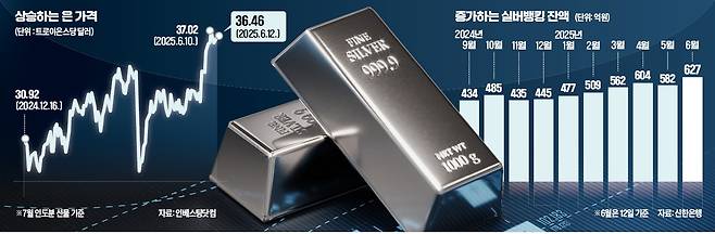 거듭 뛰는 가격에 국내에서도 은 투자 열기가 달아오르고 있다. 신한은행의 실버뱅킹 잔액은 12일 627억원으로 지난해 말(445억원)보다 40.8% 불어났다. 계좌 수(1만8580개)도 같은 기간 1704개 늘었다. 신한은행은 국내 시중은행 중 유일하게 실버뱅킹 상품을 판매하고 있다.