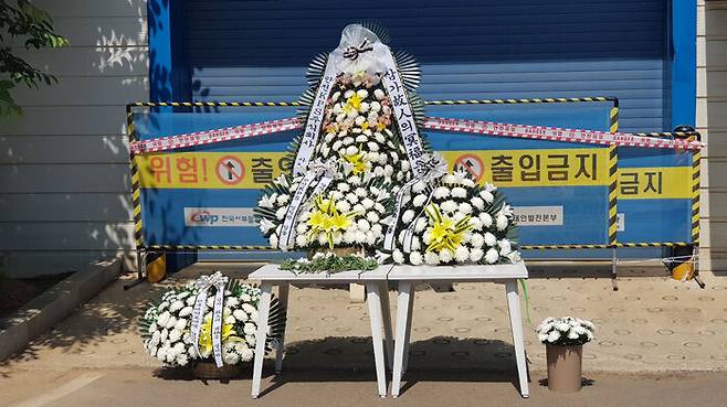 ▲ 태안화력발전소 내 한전KPS 태안화력사업소 앞에 작업 중 사망한 한전 KPS 하청업체 소속 비정규직 노동자 김충현 씨를 기리는 근조 화환이 놓여 있다.
