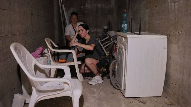 ▲ 이스라엘인들이 15일 아침, 이란에서 발사된 미사일에 맞은 주거 지역의 대피소에 머물고 있다.