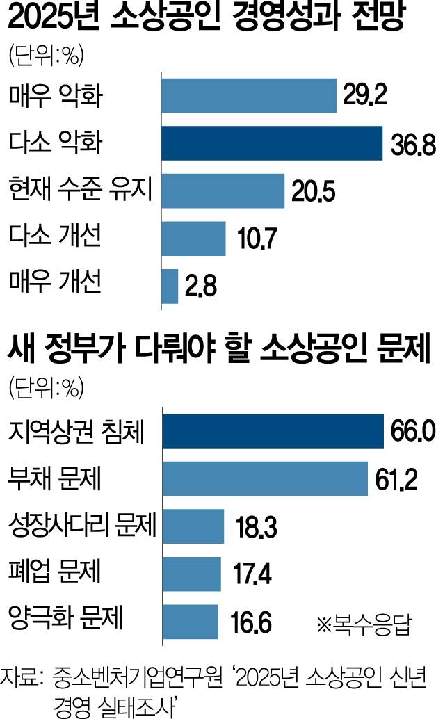 이 같은 소상공인들의 경영난은 더욱 심화될 가능성이 크다는 게 중론이다. 중소벤처기업연구원이 지난달 실시한 소상공인 정책 방향 실태 조사에 따르면 소상공인 3명 중 2명은 올해 사업 전망에 대해 부정적 입장을 보인 것으로 나타났다. ‘2025년 사업체 경영 성과 전망’에 대한 질문에 ‘매우 악화될 것’이라는 답변은 29.2%, ‘악화될 것’으로 말한 비율은 36.8%에 달했다.