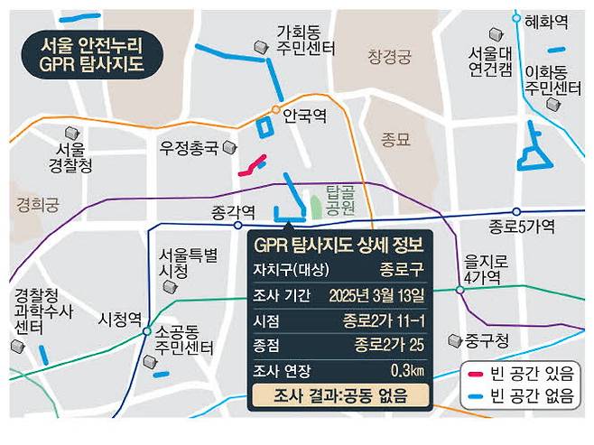 서울시는 "지역 정보를 보다 편리하게 확인할 수 있도록 GPR 탐사지도를 새롭게 추가하고 지도에서 GPR 탐사 정보를 바로 찾아볼 수 있도록 개선했다"며 "지도를 통해 누구나 관심 지역의 GPR 탐사 결과와 지하 공동 발생 여부를 직관적으로 확인할 수 있게 개선한 것이 핵심"이라고 설명했다.