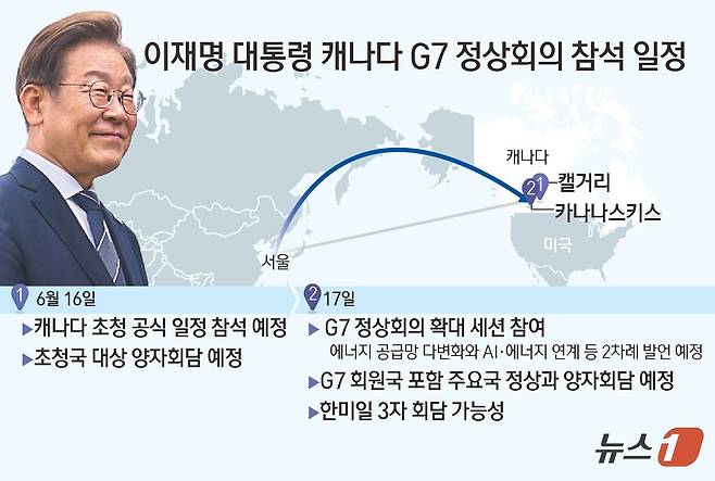 (서울=뉴스1) 김초희 디자이너 = 이재명 대통령이 15∼17일(현지시간) 캐나다에서 열리는 주요 7개국(G7) 정상회의에 참석하기 위해 1박3일 일정으로 16일 출국한다. 취임 후 첫 해외 방문에 나서는 이 대통령은 이번 회의 기간에 한미·한일 정상회담도 조율 중이다. 이번 일정에는 김혜경 여사도 함께할 예정이다.
