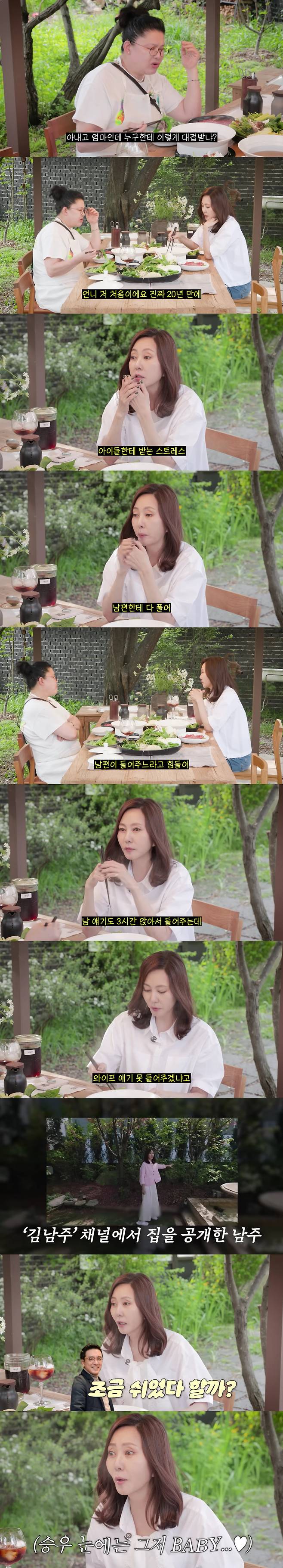 이어 이영자가 "아내고 엄마인데 누구한테 이렇게 대접받겠냐. 스트레스는 어떻게 푸느냐. 일이나 가족, 남편으로부터 받는 스트레스 말이다"라고 묻자, 김남주는 "20년 만에 이렇게 대접받는 건 처음"이라며 "아이와 일로 받는 스트레스를 모두 남편에게 푼다"고 고백했다.